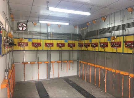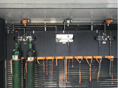 钢瓶间及实验室安装相关气体专用报警探头,若气体发生泄漏,泄漏探测报警器会发出声光报警同时给出信号到排风阀,开启阀门换气,保证供气安全。