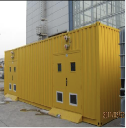 1.3、新设气瓶间位置及型式 :氩气(Ar)、氧气(O2)、乙炔(C2H2)三种气瓶在中心化验楼外安全舱内置放,采用集中供气方式远程输送到各实验室。安全舱的外形及位置见下图: