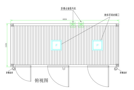 1.1.4门窗:1、安全舱放置区采用B型抗爆门,,一旦发生爆炸时,在空气冲击波作用下抗爆门应有效抵抗冲击波,设备门采用钢制门。为了防止危险爆炸物在舱体内爆炸,避免内冲击波释放不及时,在舱体顶部设置泄爆窗口(600*600)。