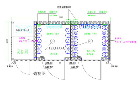 1.1.7暖通:1、采用防爆空调(恒定舱内温度,避免高温),防爆风机(与舱内气体泄漏监测系统联动,在气体发生泄漏时,通过PLC模块信号传递,开启排风,导出舱内危险气体,避免浓度超出爆炸极限)。